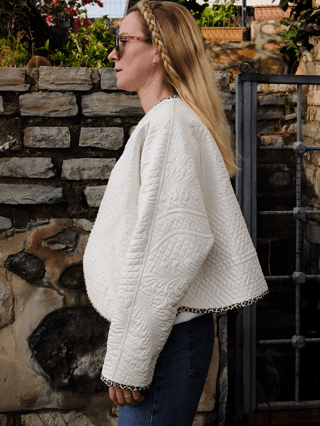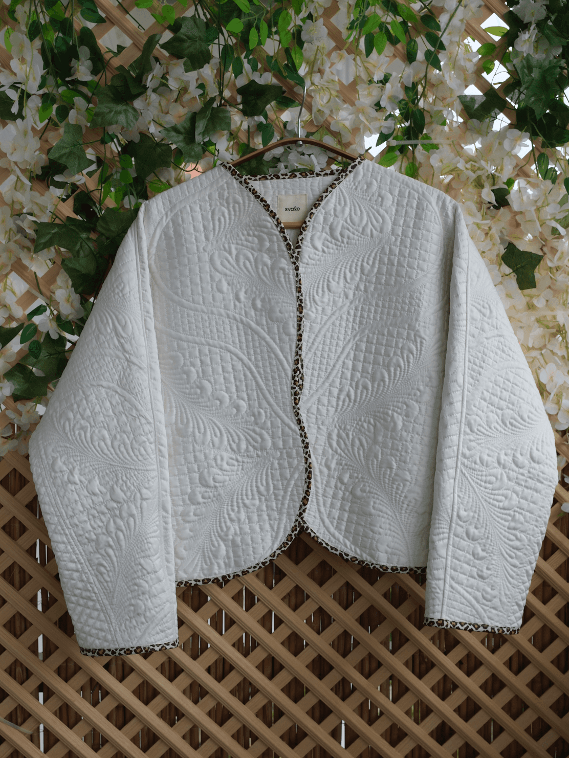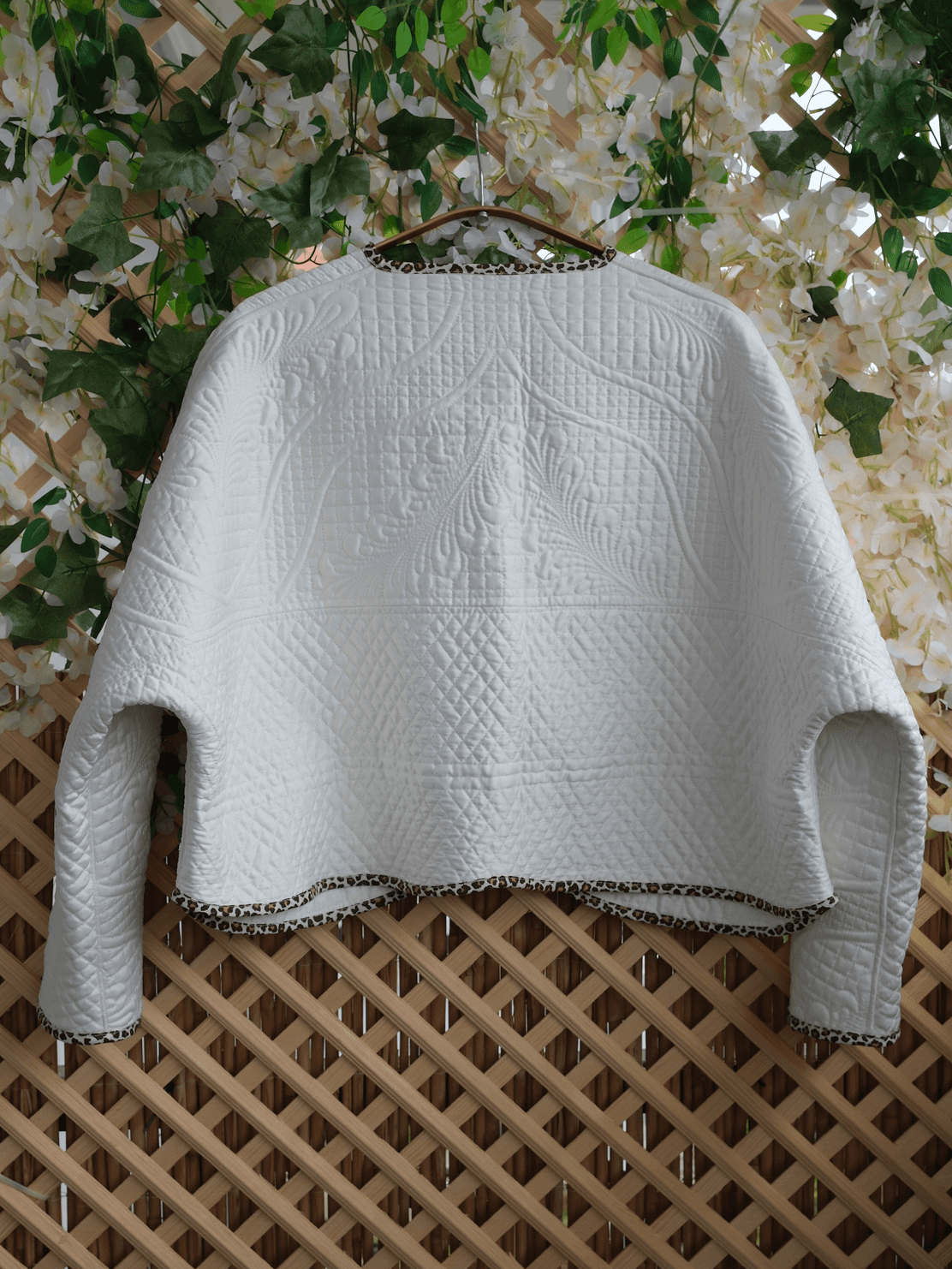 A soft, sculptural layer that feels good in everyday wear and brings effortless elegance to special occasions. Its curved silhouette and leopard-print binding add warmth and personality to the clean white quilted texture. Created as a single unique piece.