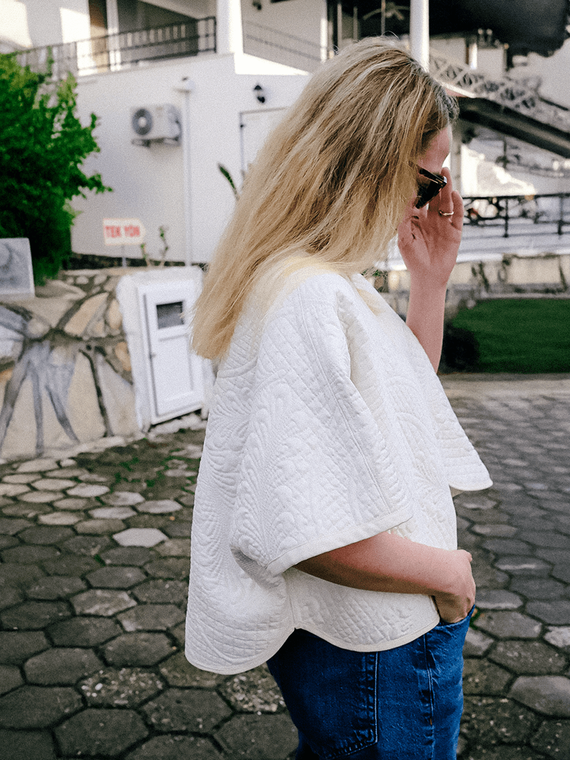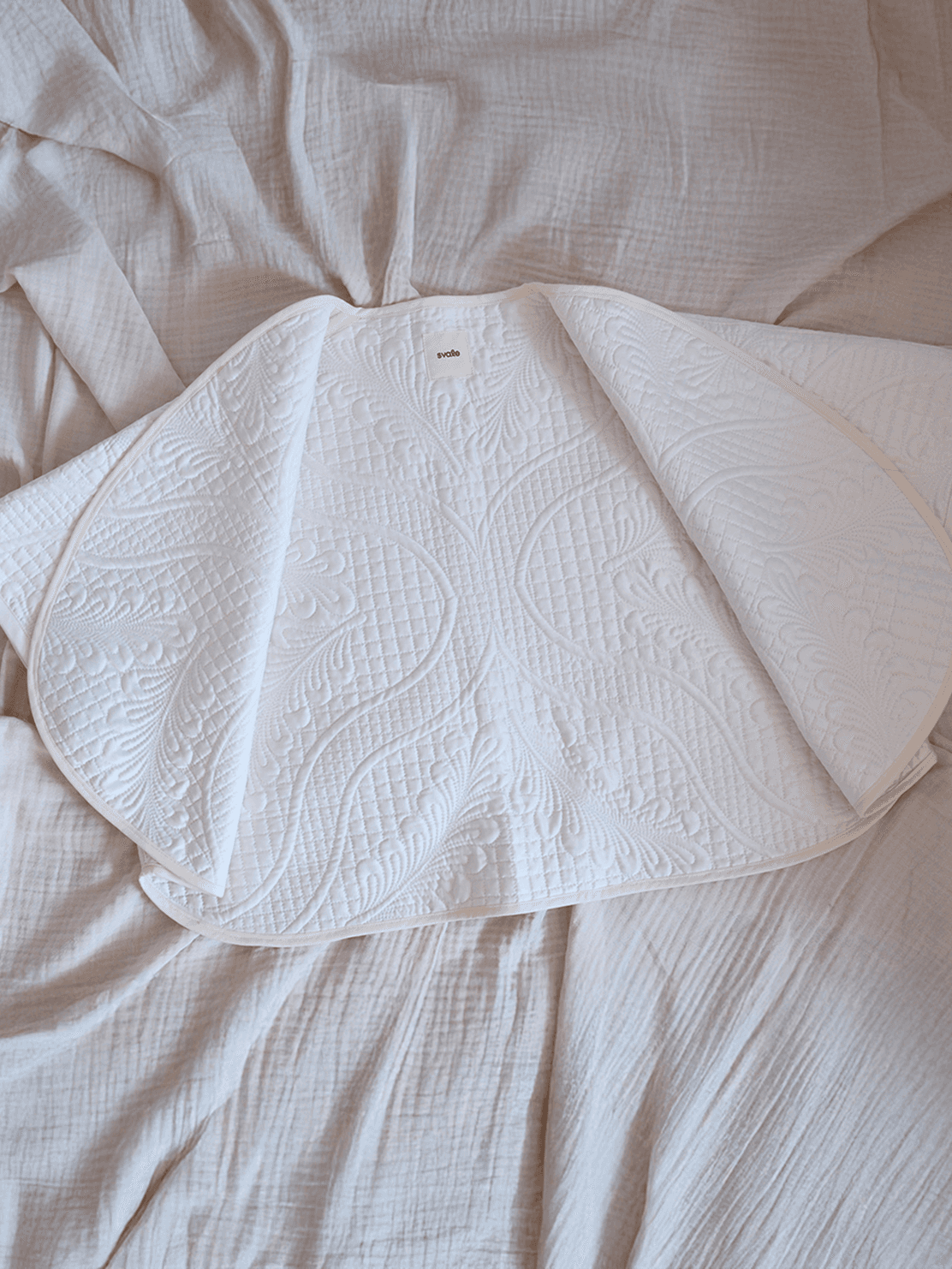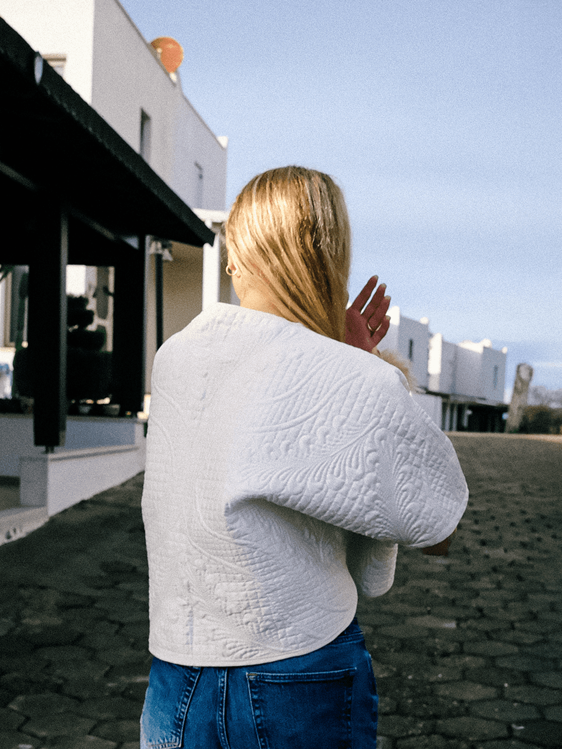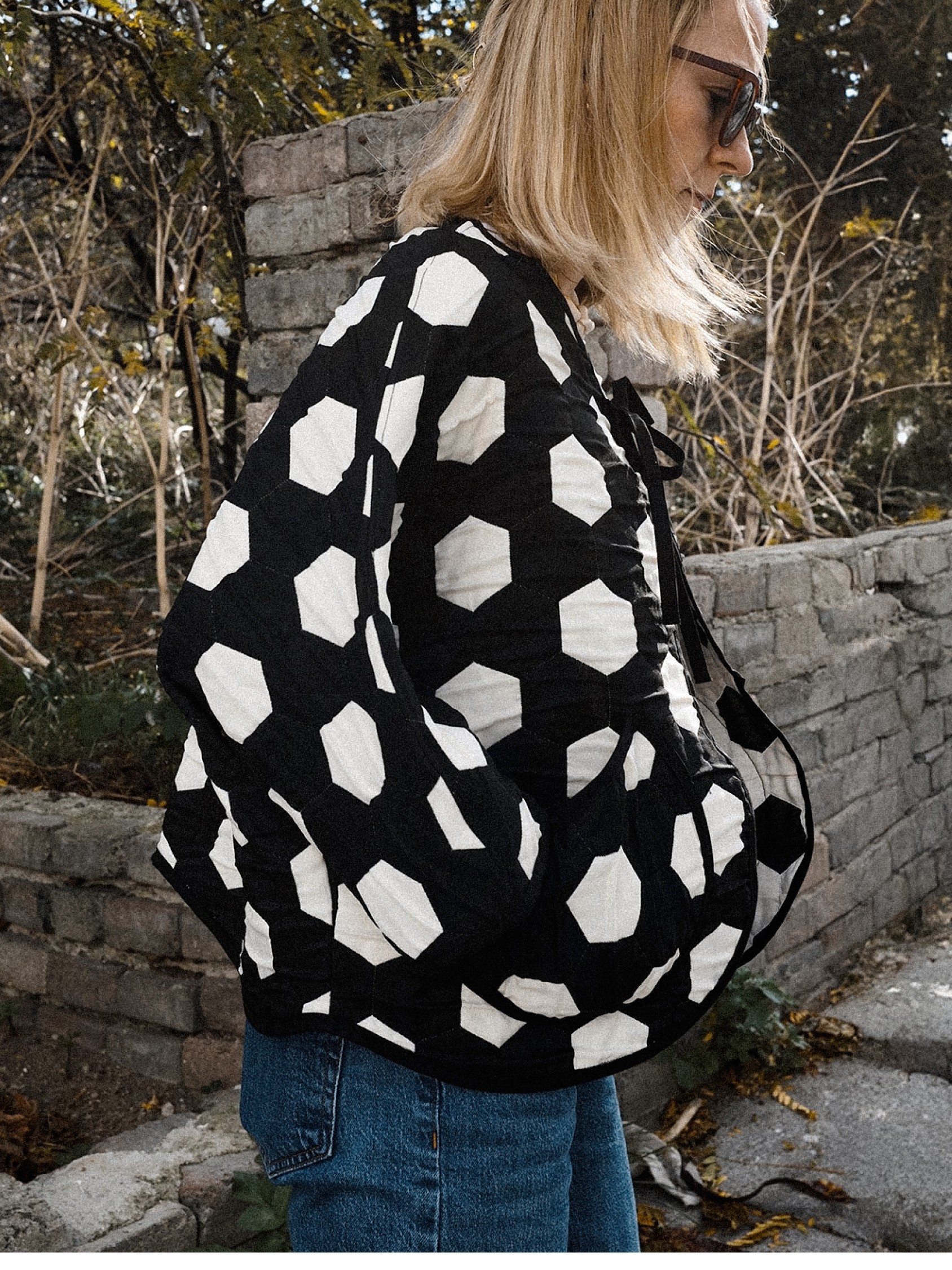 A light and sculptural layer defined by softness and quiet detail. Its clean white quilted surface features flowing stitched patterns that create depth without overwhelming the form. The curved wrap silhouette adds gentle movement, making it feel effortless yet considered in everyday wear. Created as a single unique piece.