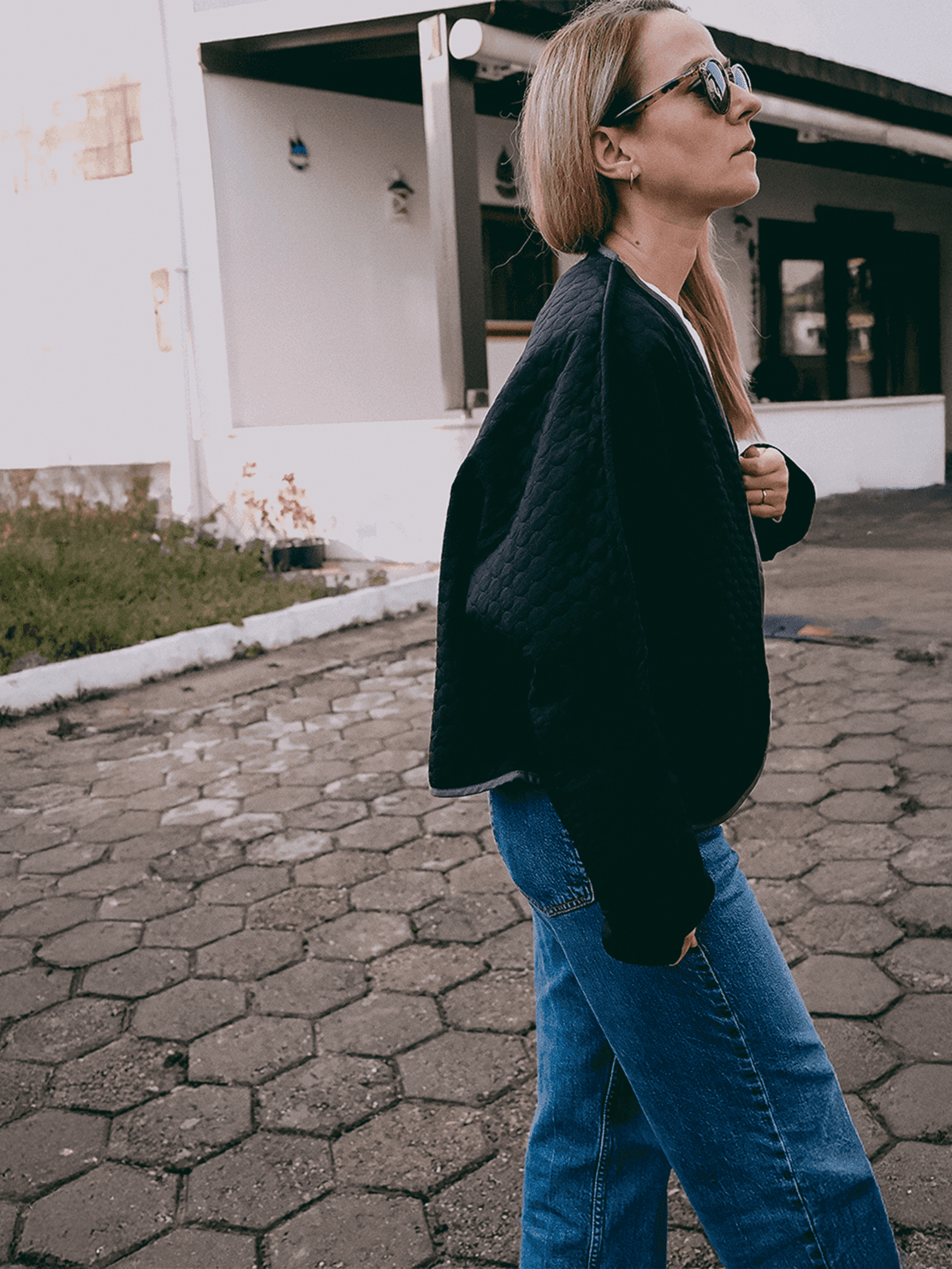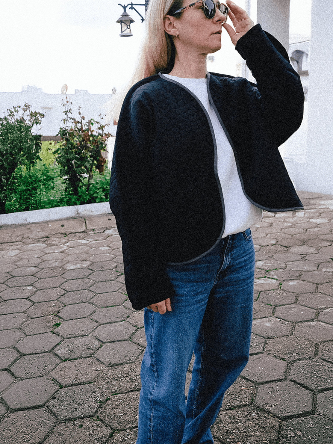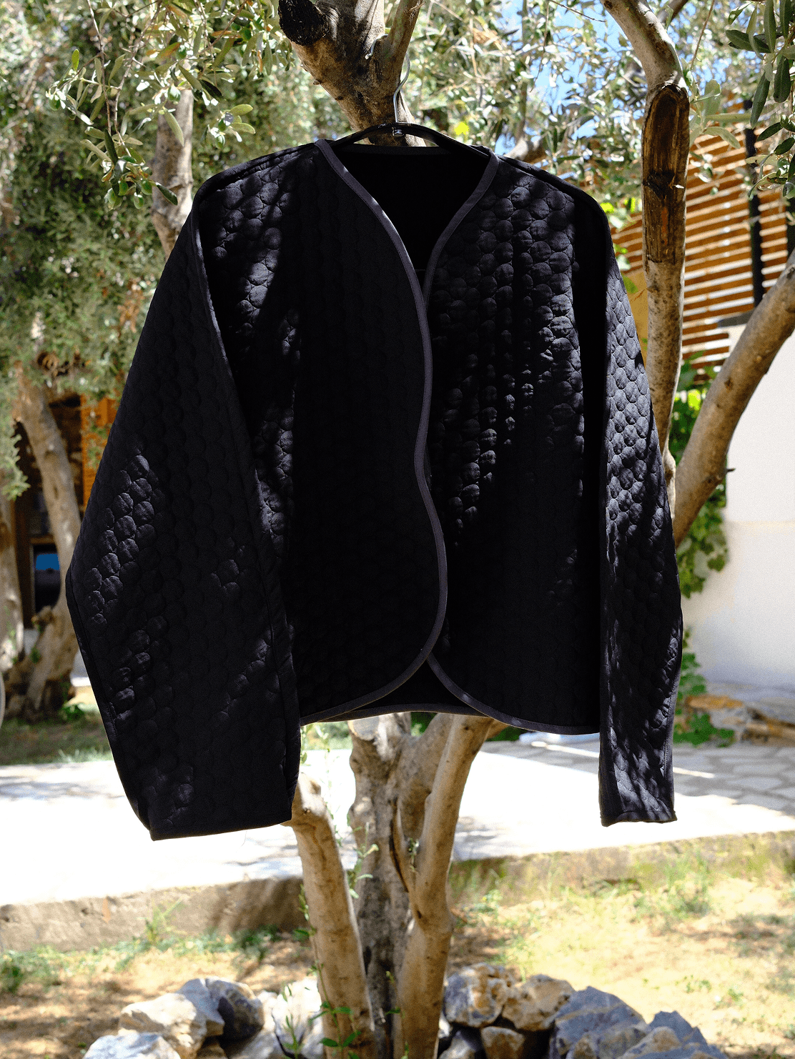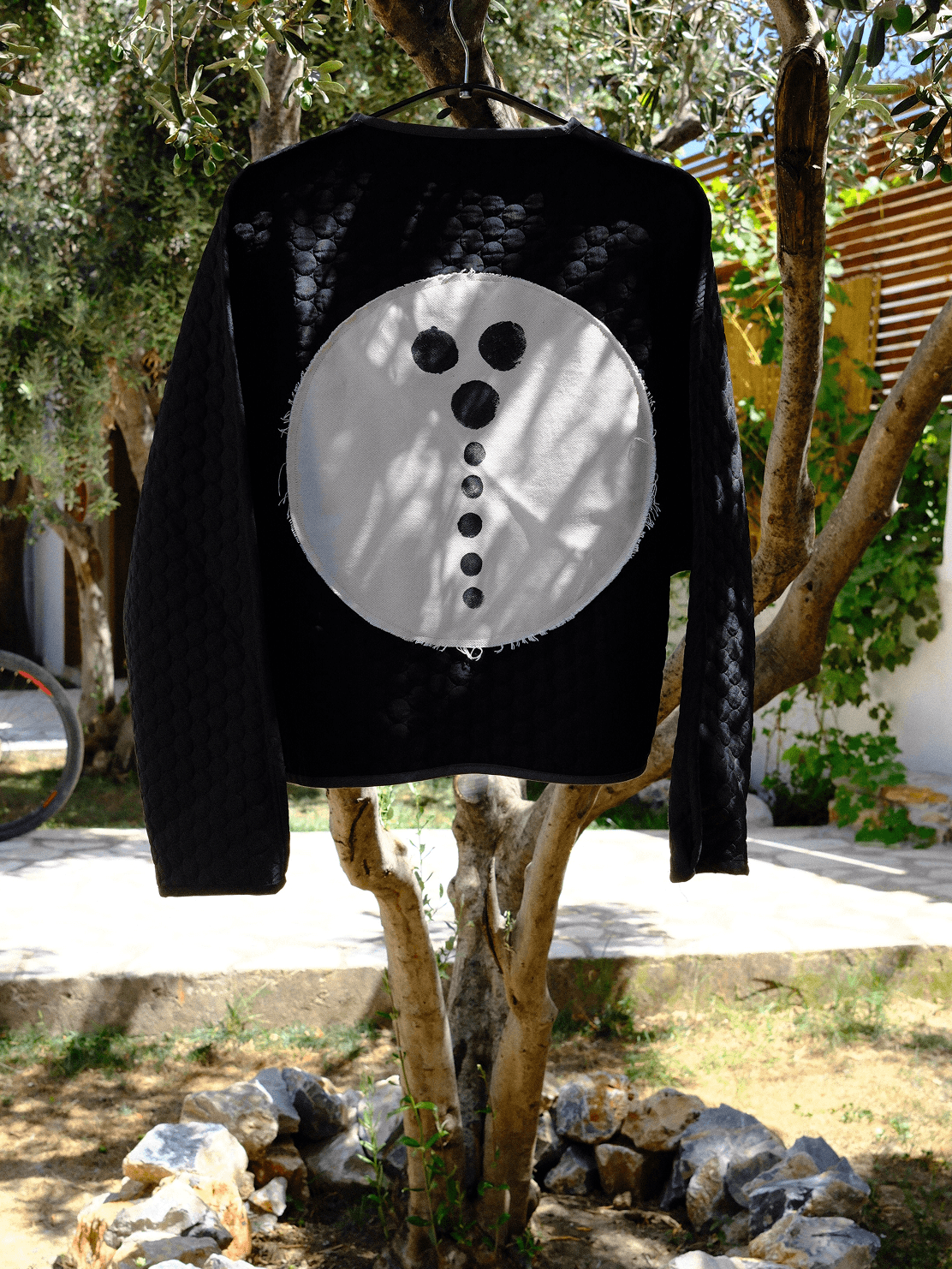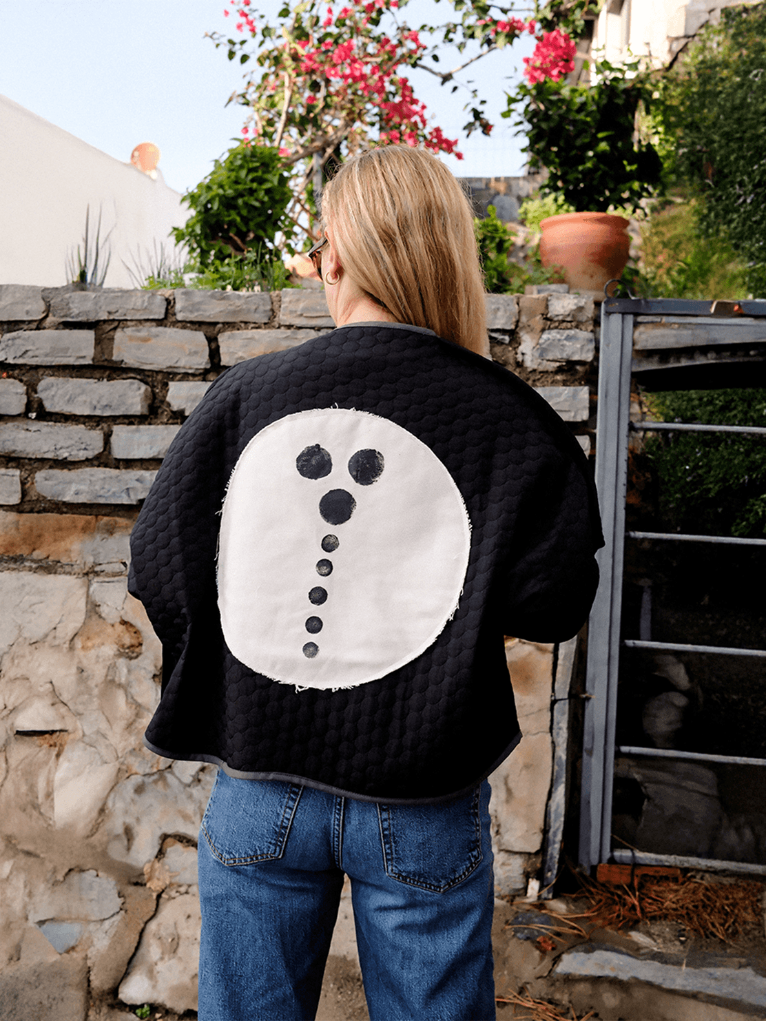 A bold yet thoughtful layer defined by contrast and texture. Its deep black quilted surface carries a subtle tactile rhythm, while the soft curved front keeps the silhouette clean and understated. At the back, a circular ivory patch with delicate stitched dots adds an unexpected, artistic focal point. Created as a single unique piece.