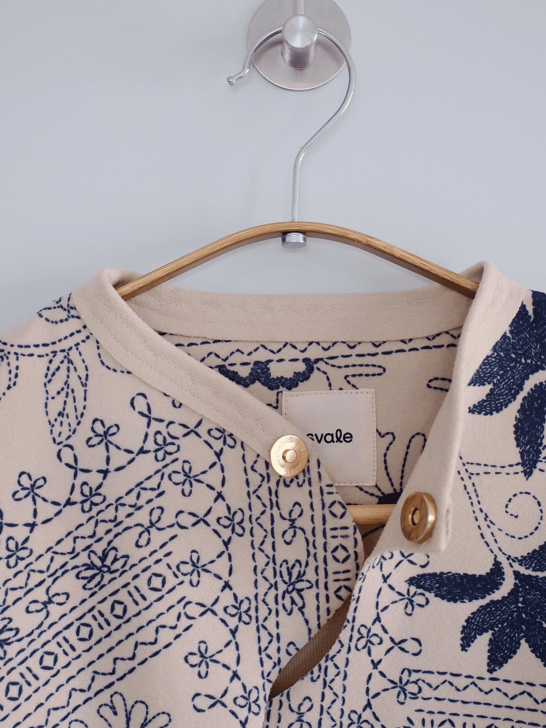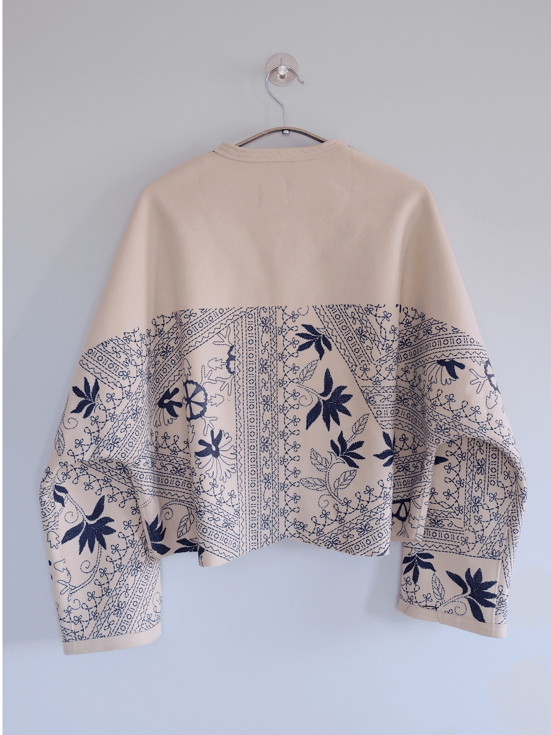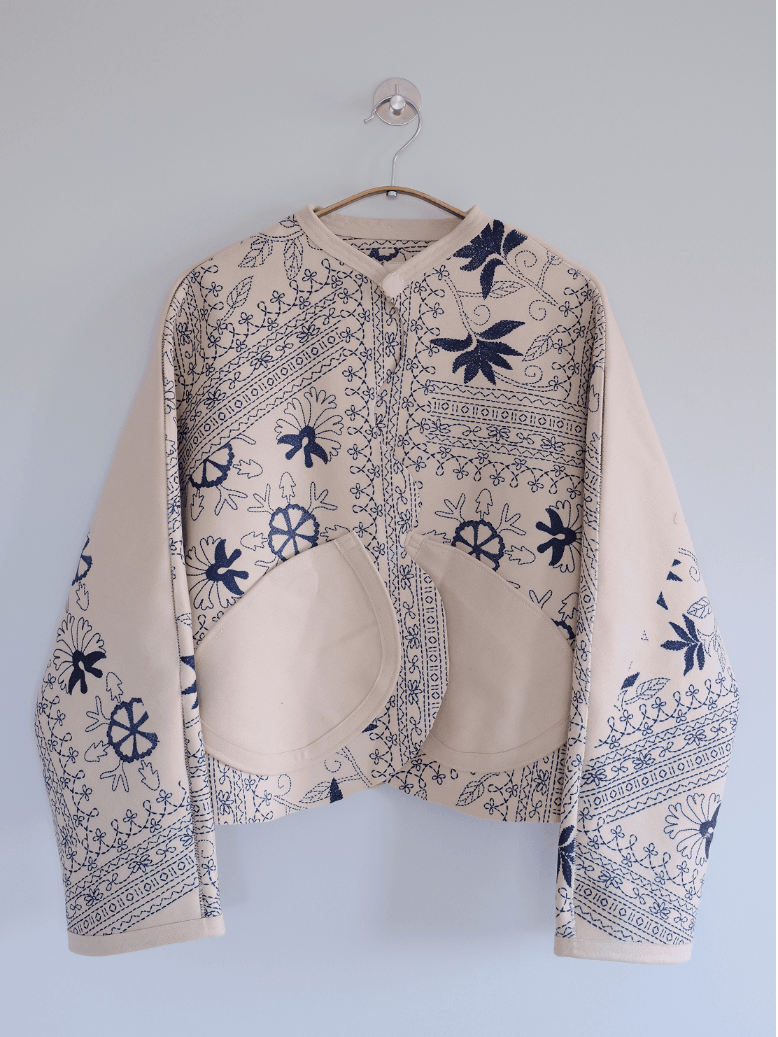Cut from heavyweight interlock fabric, Velu moves with quiet strength — simple in form, yet full of character. The curved front and large rounded pockets give it an easy shape, while a single gold snap at the neckline adds a calm sense of balance.